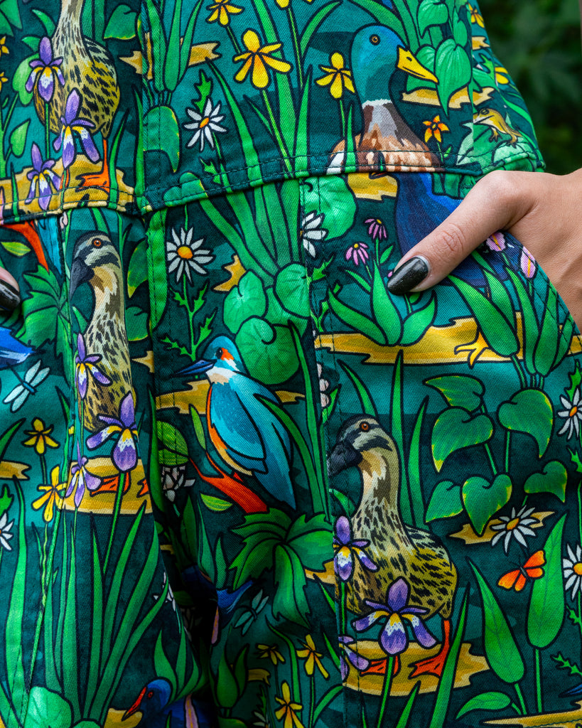 Embrace the wild with the stunning green Pond Birds dungarees, featuring a whimsical design by Wafflemama filled with birds, insects, and blooming nature. Ethically produced and effortlessly stylish, these dungarees are perfect for nature enthusiasts, those who love bright colours, and anyone seeking comfort with a standout look. Made from soft stretch twill and adorned with lively garden creatures, they’re perfect for daily adventures, relaxing with pockets full of treats, or simply enjoying a leafy, laid-back vibe. Whether you’re out birdwatching or meeting friends for brunch, these dungarees have you covered in style and comfort.